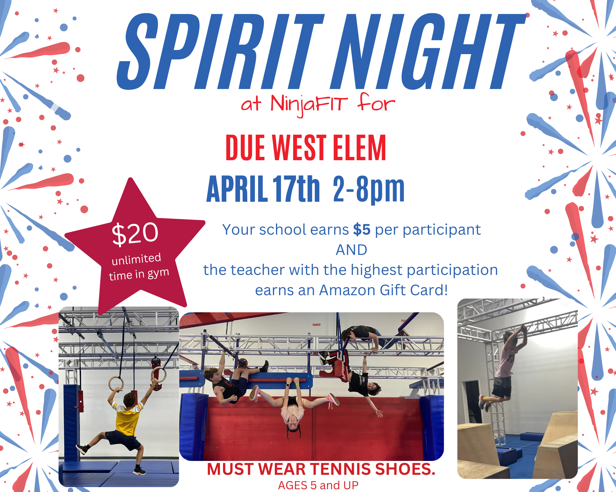 Come train, climb, swing, and challenge yourself or a friend on real Ninja Warrior–style obstacles while supporting the Due West PTA.